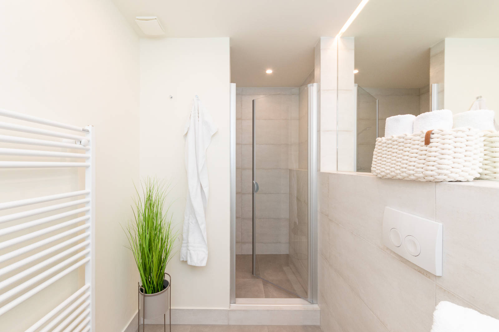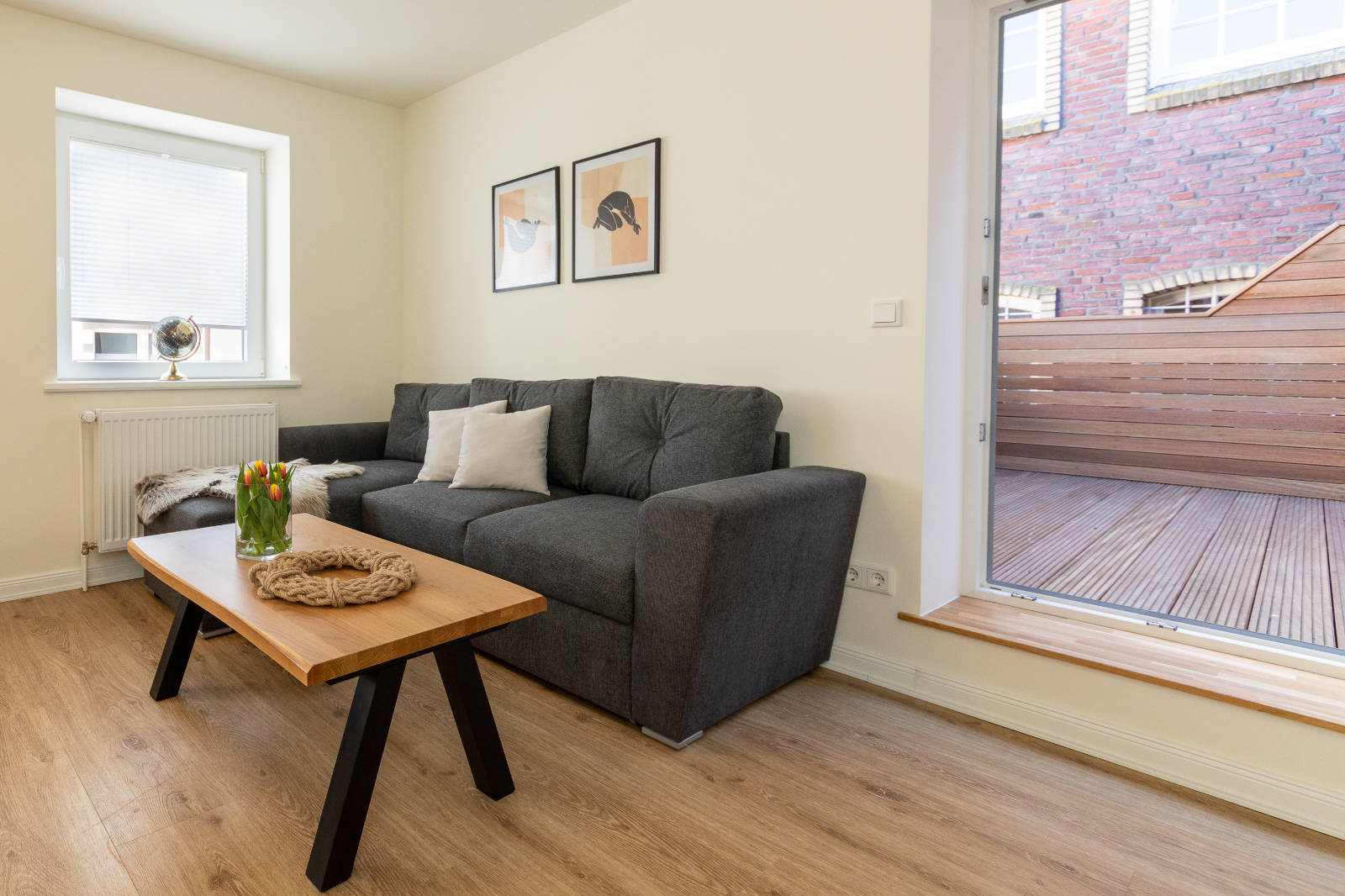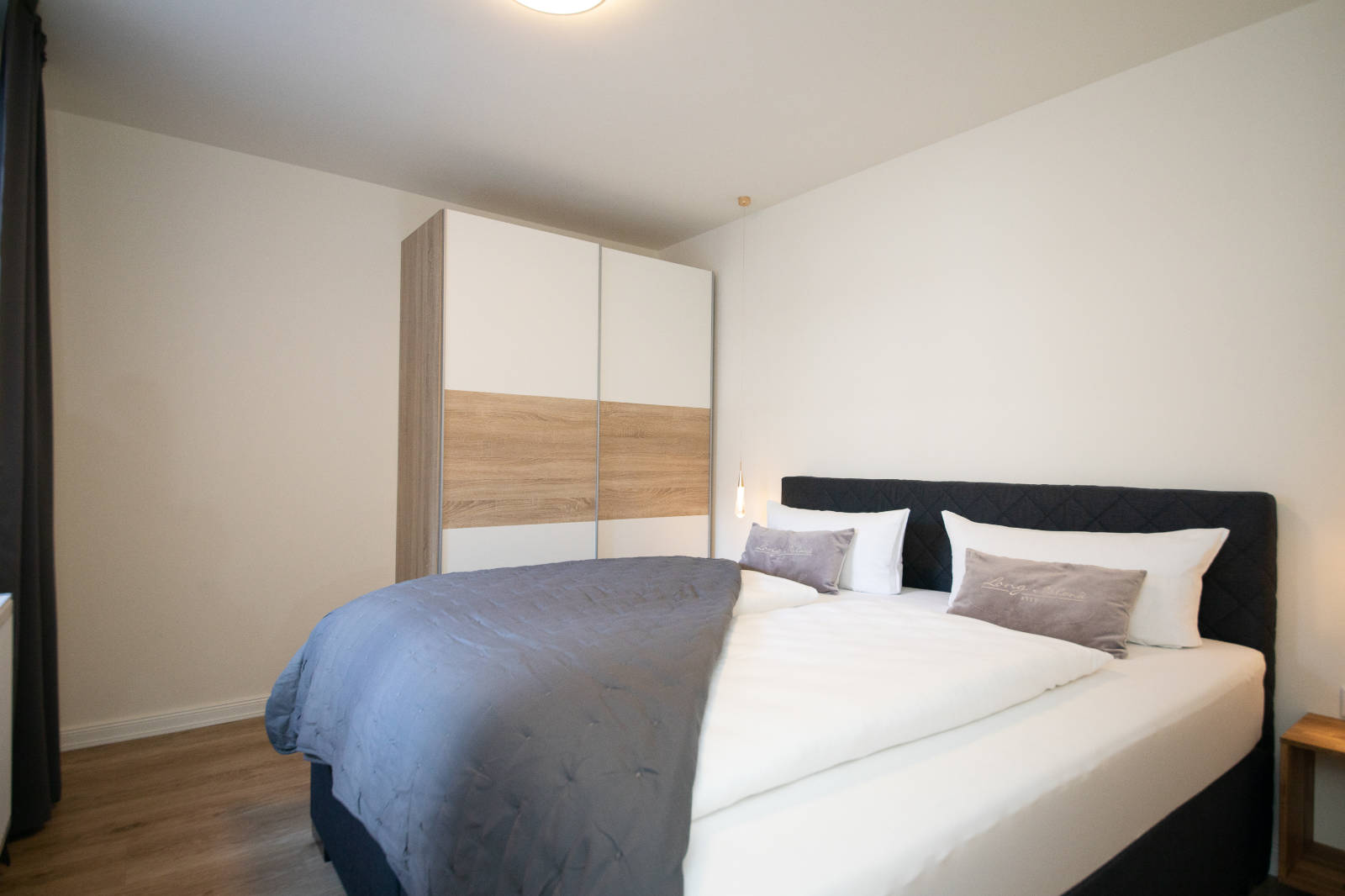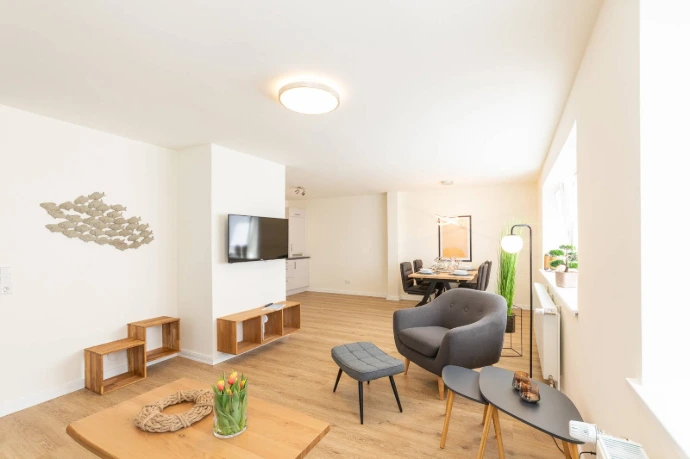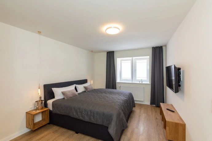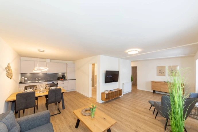 Die ca. 60 m² großen, neu eingerichteten Apartments verfügen jeweils über einen großzügigen und modernen Wohn- und Essbereich mit Kochnische, ein Schlafzimmer mit Doppel-Boxspringbett und ein Badezimmer mit Dusche.